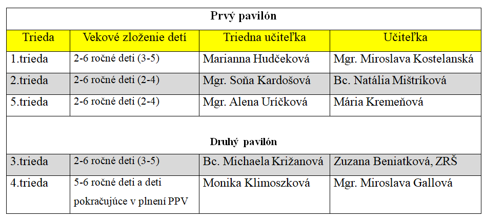 V budove sa nachádza 5 tried, v ktorých sú deti vo veku 2 - 6 rokov. V materskej škole je zamestnaných 18 pracovníkov, z toho sú 10 pedagógovia, 8 nepedagogických pracovníkov. Dve pani upratovačky, jedna pani upratovačka, ktorá zabezpečuje chod práčovne, 1 pracovníčka v prevádzke, pán školník - údržbár - kurič , tri pani kuchárky a pani vedúca školskej jedálne zabezpečujúce prevádzku školskej kuchyne a jedálne.